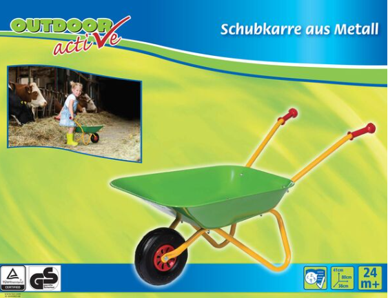 Abholung im Geschäft am nächsten Werktag ab 10:00 UhrOutdoor active Schubkarre Metal grün/gelb ist eine hochwertige Schubkarre mit Metallmulde, Kunststoffgriffen und Hartplastikbereifung.